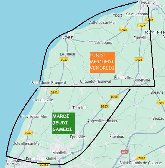 Saint-Jouin-Bruneval, Heuqueville, Turretot, Gonneville-la-Mallet, Sainte-Marie-au-Bosc, Beaurepaire, La Poterie-Cap-d'Antifer, Le Tilleul, Étretat, Bénouville, Bordeaux-Saint-Clair, Les Loges, Vattetot-sur-Mer, Yport, Froberville, Saint-Léonard, Fécamp, Épreville, Maniquerville, Gerville, Auberville-la-Renault, Fongueusemare, Bretteville-du-Grand-Caux, Goderville, Écrainville, Criquetot-l'Esneval, Vergetot, Saint-Sauveur-d’Émalleville, Hermeville, Angerville-l’Orcher, Manéglise, Épouville, Fontenay, Rolleville, Notre-Dame-du-Bec, Saint-Martin-du-Bec, Mannevillette, Cauville-sur-Mer, Octeville-sur-Mer.