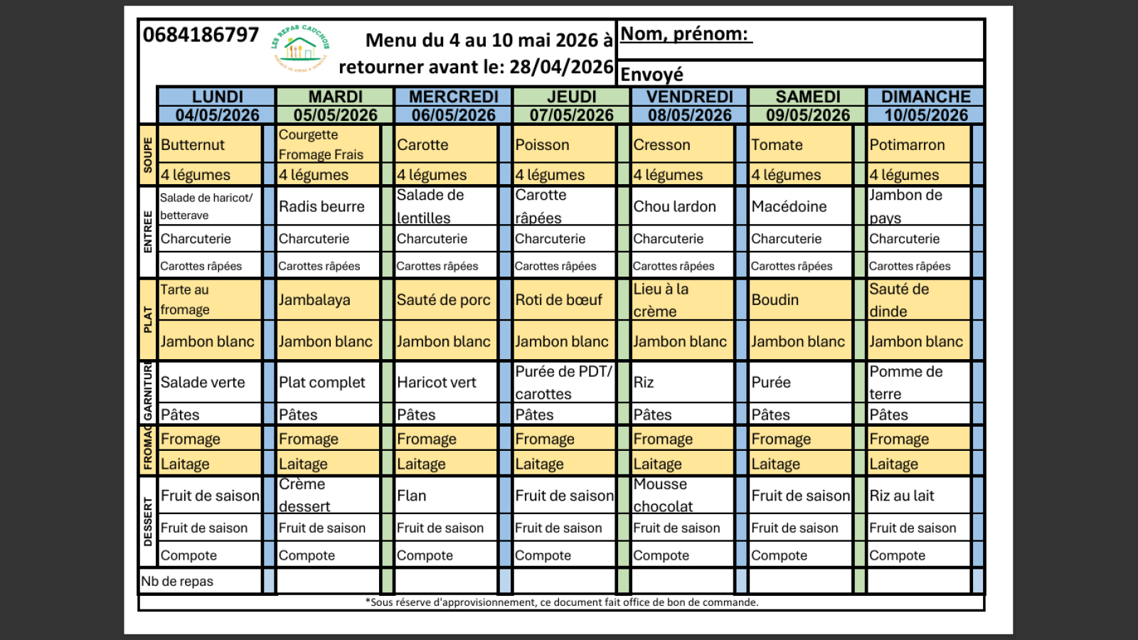 Découvrez les menus du mois de mai, pensés pour allier plaisir, équilibre et saveurs de saison. Chaque semaine, une variété de soupes maison vous est proposée, allant des classiques comme la soupe de carotte ou de tomate, aux recettes plus gourmandes comme la soupe de poisson ou la soupe de courgette au fromage frais.